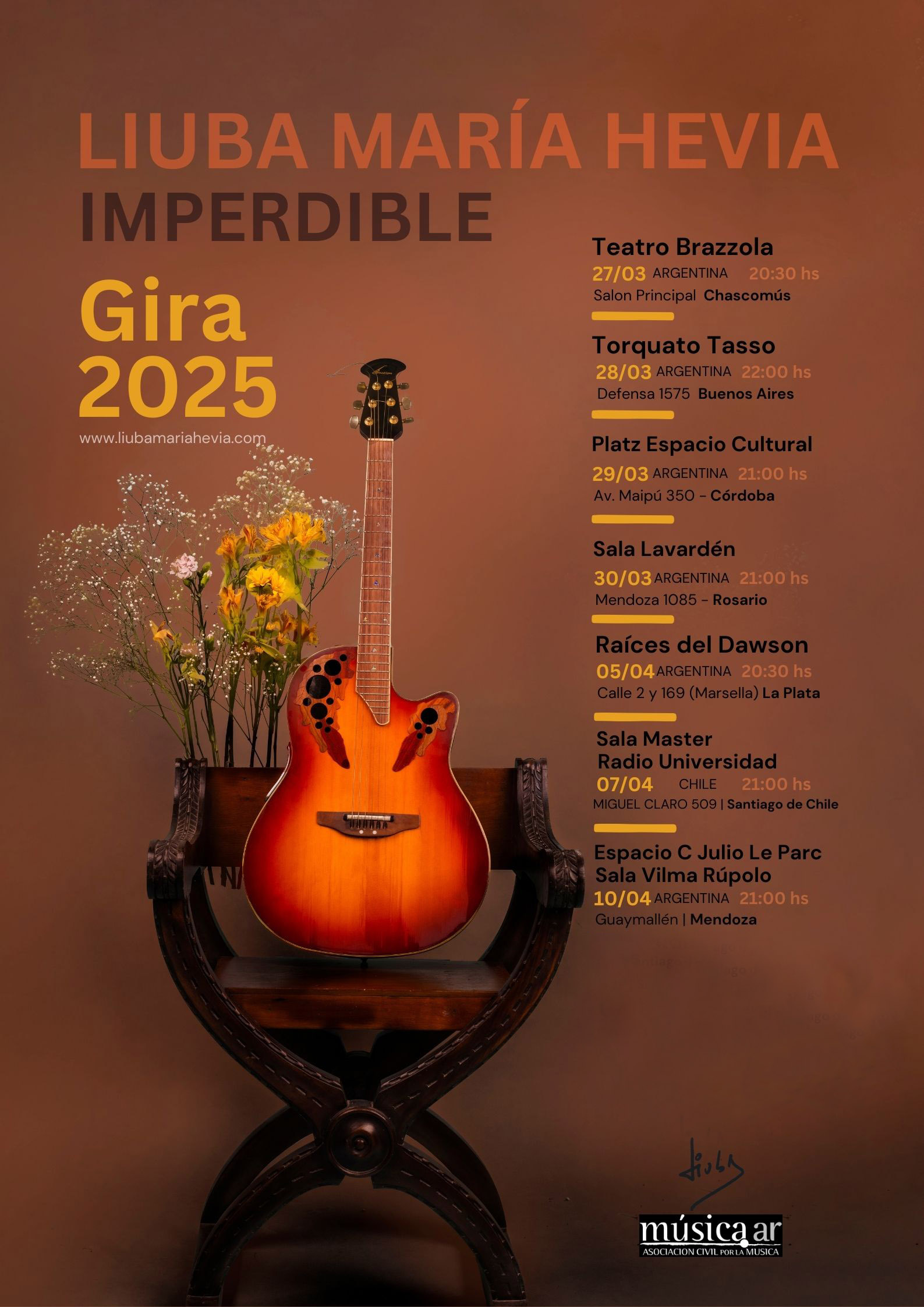 Celebración de la X edición del evento Alma creadora, fundado por Liuba María, en el Centro Cultural La Elipa en Madrid. Participan Liuba María Hevia, las cantautoras Julie Freundt (Perú), Clara Cantore (Argentina) y una cuarta por confirmar.